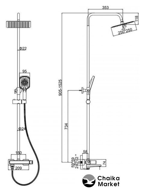 | Диаметр (ширина) верхнего душа | 250 мм |