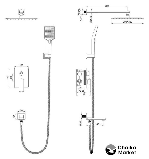 душевая система (с верхним душем), настенный/скрытый монтаж, механический смеситель, верхний душ 300 мм, ручной душ 132 мм