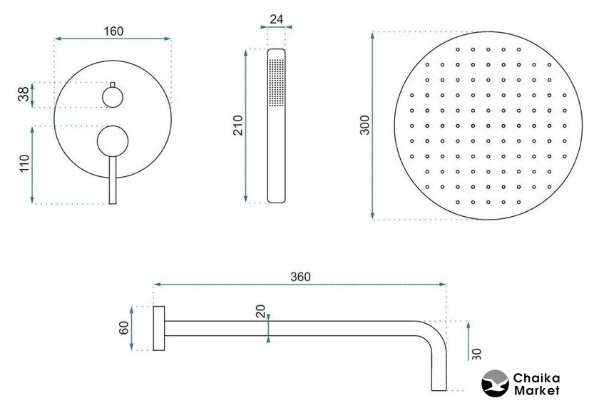Диаметр (ширина) верхнего душа | 300 мм |