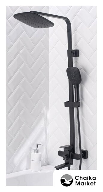 Комплектация | верхний душ, штанга, ручной душ (лейка), держатель лейки, шланг, смеситель, излив для ванны |