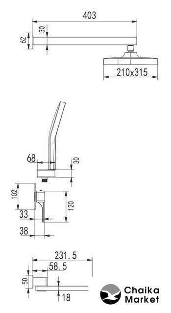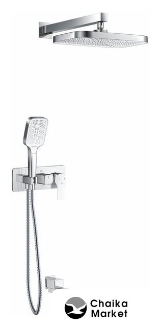 Комплектация | верхний душ, ручной душ (лейка), держатель лейки, шланг, смеситель, излив для ванны |