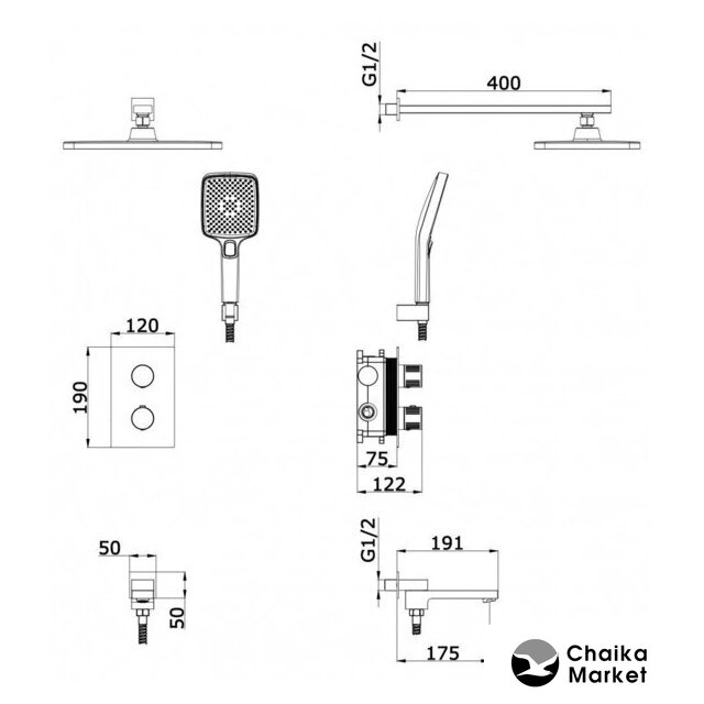 Комплектация | верхний душ, ручной душ (лейка), держатель лейки, шланг, смеситель, излив для ванны |