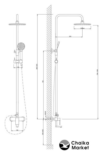 душевая система (с верхним душем), настенный монтаж, механический смеситель, верхний душ 220 мм, ручной душ