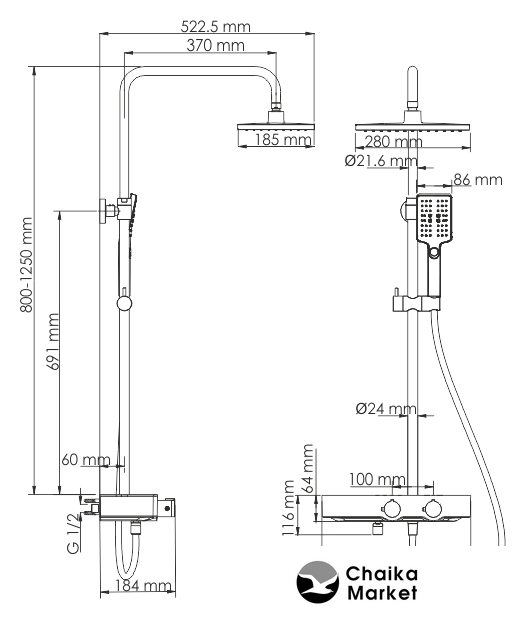 душевая система (300 мм), настенный монтаж, термостатический смеситель