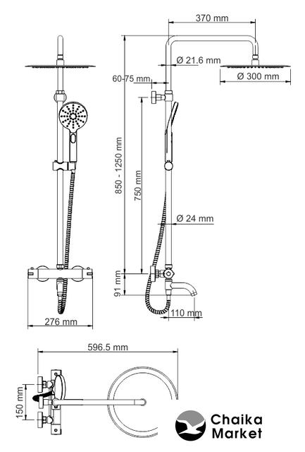 душевая система (с верхним душем), настенный монтаж, термостатический смеситель, верхний душ 300 мм, ручной душ