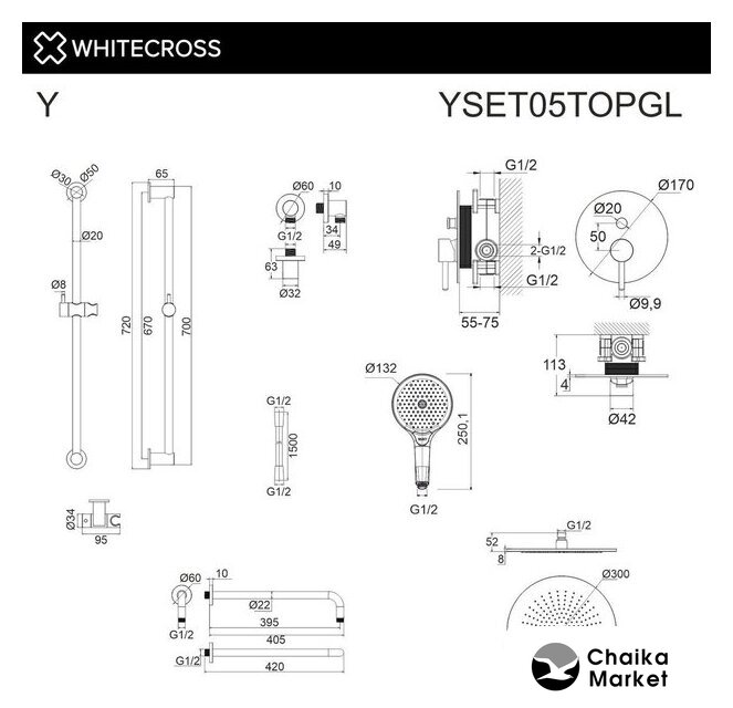 Комплектация | верхний душ, штанга, ручной душ (лейка), держатель лейки, шланг, смеситель |