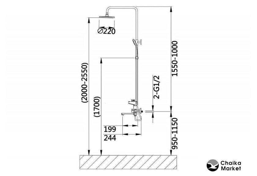 душевая система (250 мм), настенный монтаж, отсутствует смеситель