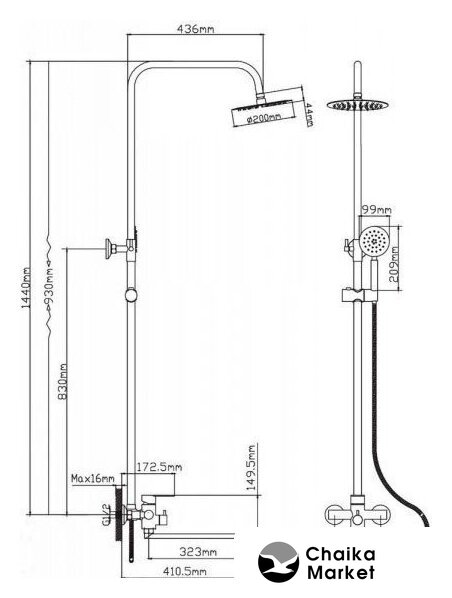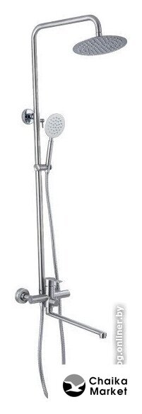 Комплектация | верхний душ, штанга, ручной душ (лейка), держатель лейки, шланг, смеситель, излив для ванны |