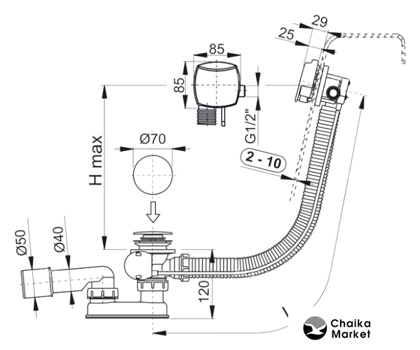 для душа, пластик/сталь, труба 40 мм, длина 750 мм, сливная решетка, цвет крышки: черный