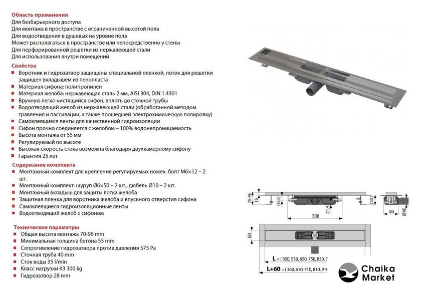 для душа, полипропилен, труба 50 мм, длина 750 мм, комбинированный, сливная решетка