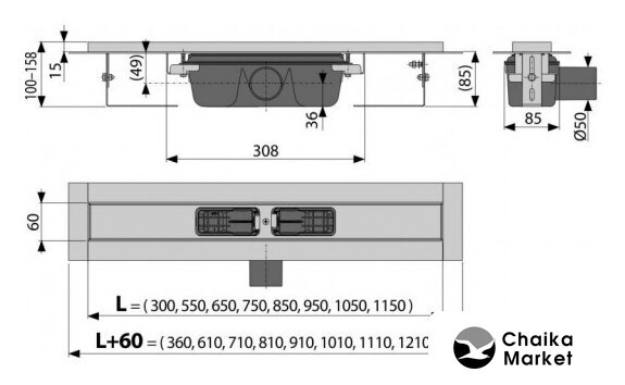 для душа, полипропилен/сталь, труба 40 мм, длина 1010 мм, гидрозатвор