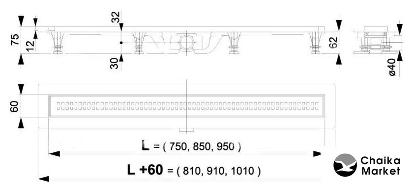 для душа, пластик, труба 40 мм, длина 950 мм, сливная решетка, цвет крышки: нержавеющая сталь