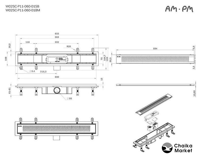 для душа, сталь/пластик, длина 740 мм, сухой затвор, сливная решетка