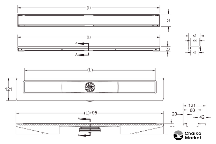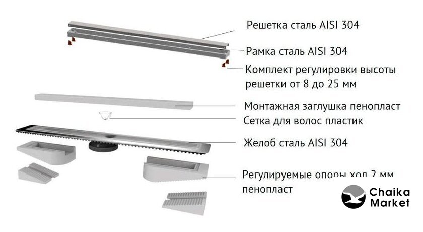 для душа, сталь, труба 50 мм, длина 750 мм, сливная решетка, цвет крышки: нержавеющая сталь