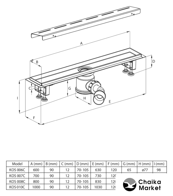 для душа, сталь, труба 50 мм, длина 800 мм, сливная решетка, цвет крышки: нержавеющая сталь