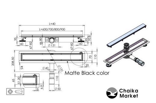 для душа, сталь, труба 50 мм, длина 800 мм, сливная решетка, цвет крышки: нержавеющая сталь