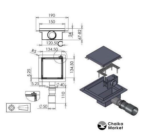 для душа, труба 50 мм, гидрозатвор, сливная решетка, цвет крышки: хром