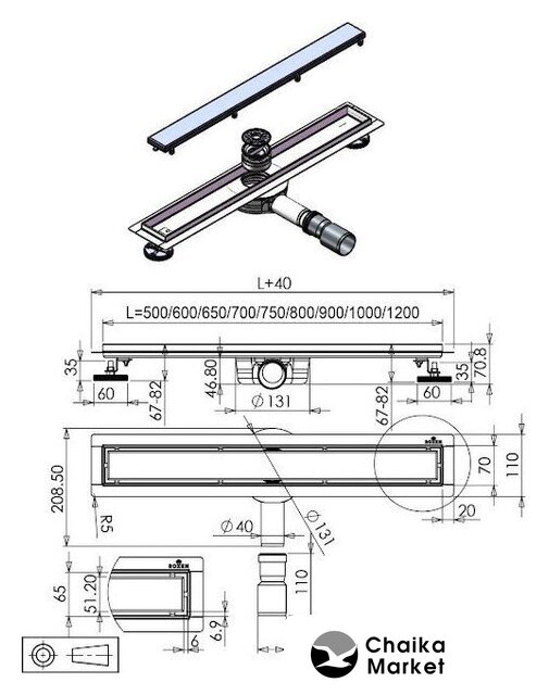 для душа, сталь, длина 500 мм, сливная решетка
