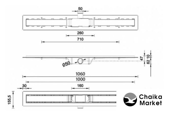 для душа, сталь, труба 50 мм, длина 900 мм, комбинированный, сливная решетка