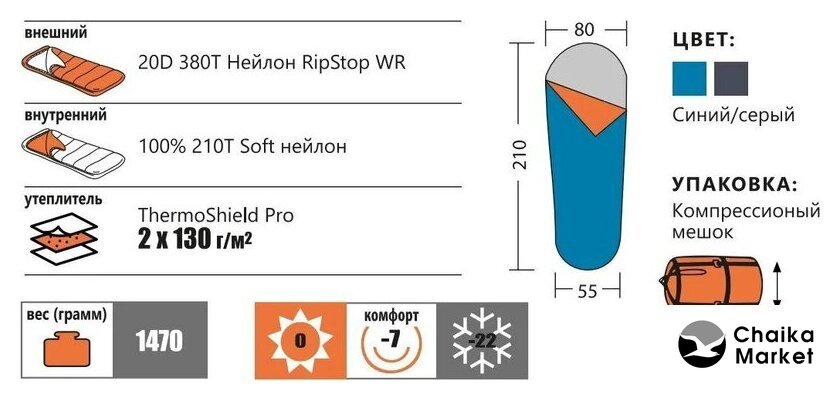 мешок-одеяло, осень/весна, синтетический, комфортная температура -2 °С, экстрем. температура -18 °С, 210x90 см