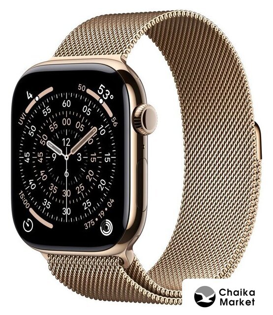 синхронизация с iOS, экран OLED, поддержка SIM-карты: eSIM, пульсометр, измерение кислорода в крови, измерение артериального давления, ЭКГ, AOD, GPS, Bluetooth 5.3, корпус: металл (титан), ремешок: металл (сталь)