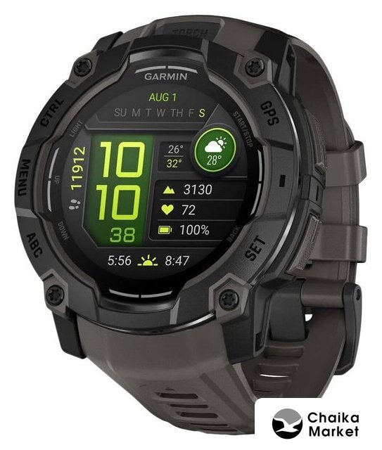 синхронизация с Android/iOS, экран Memory LCD (MIP) 1.1" x 1.1", поддержка SIM-карты: нет, пульсометр, измерение кислорода в крови, GPS, корпус: пластик/металл (алюминий), ремешок: силикон