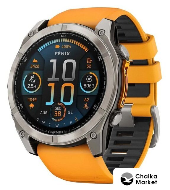 синхронизация с Android/iOS, экран Memory LCD (MIP) 1.4", поддержка SIM-карты: нет, пульсометр, измерение кислорода в крови, GPS, корпус: металл (титан)/пластик, ремешок: силикон