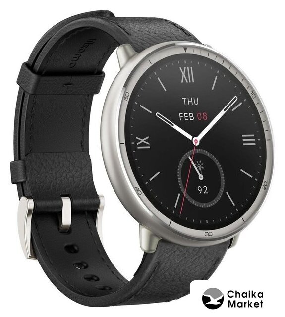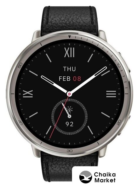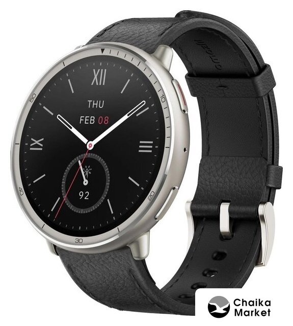 синхронизация с Android/iOS, экран AMOLED 1.32", поддержка SIM-карты: нет, пульсометр, измерение кислорода в крови, AOD, GPS, Bluetooth 6.0, корпус: металл (сталь), ремешок: кожа