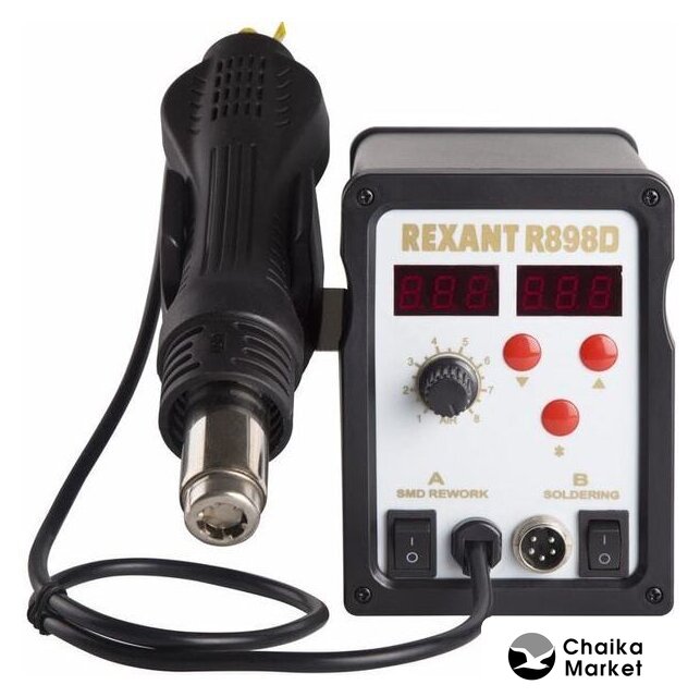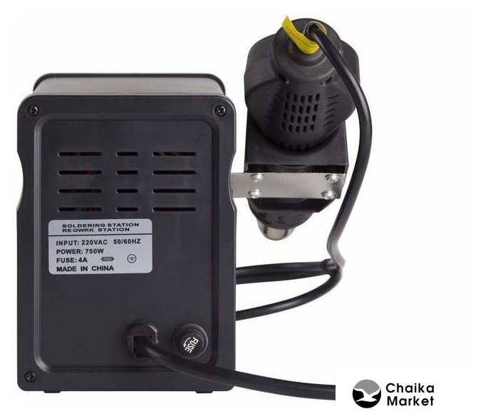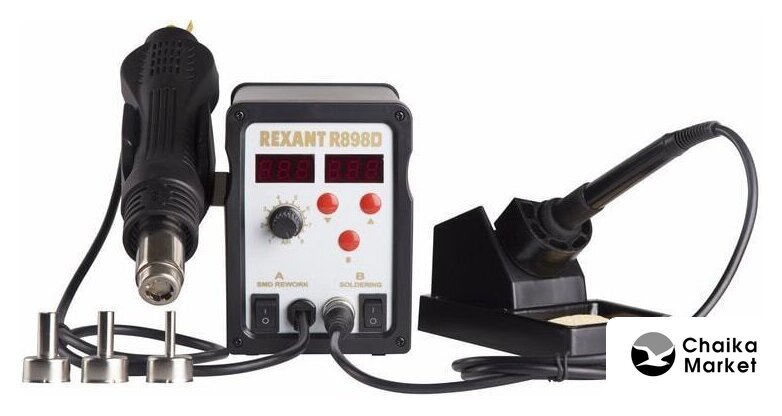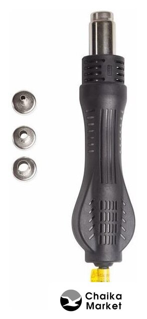 Комплектация | основной блок, термофен, паяльник, держатель паяльника, держатель термофена, губка для очистки жала паяльника (в ложементе), 3 насадки для термофена разного размера. |