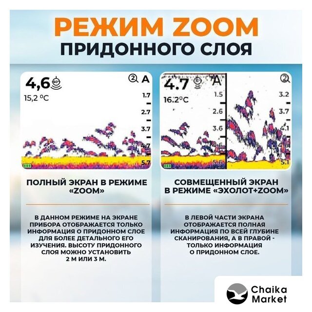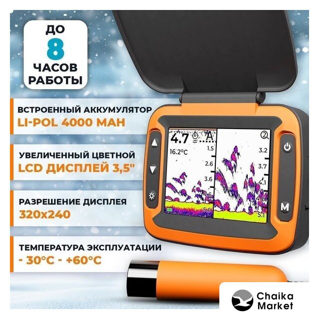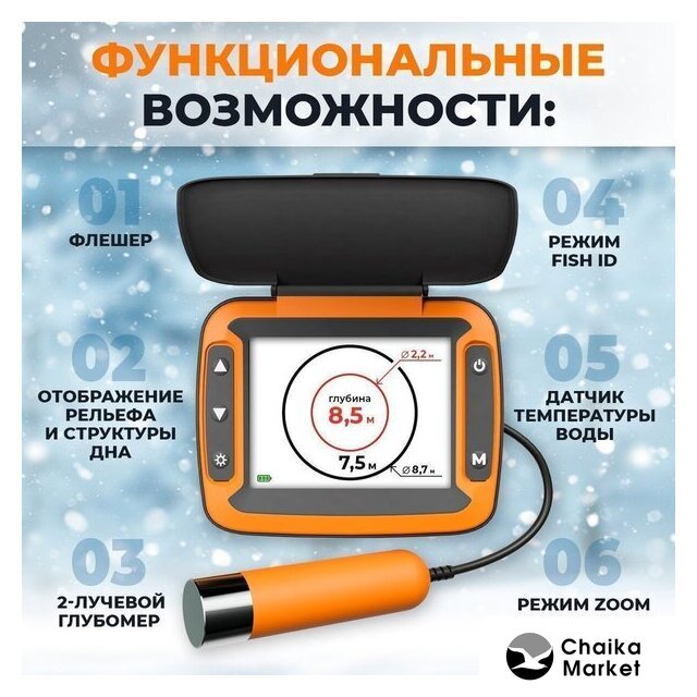 Функции | определение расстояния до рыбы, индикация рыбы в реальном времени, мелководье/отмель, датчик для зимней рыбалки |