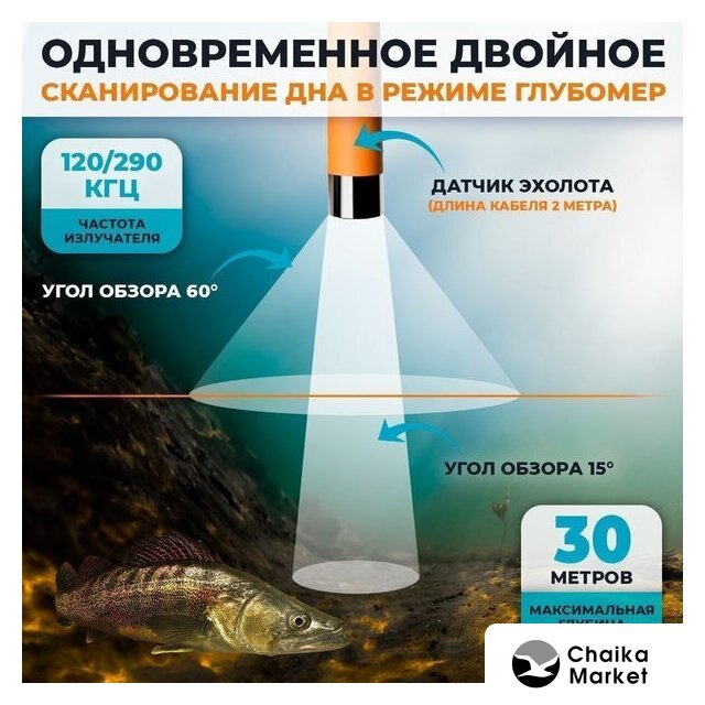 глубина сканирования - 50 м, угол излучения - 30 градусов, 2 луч(а) излучения