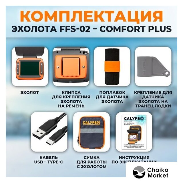 Комплектация | - эхолот (монитор + датчик)- клипса для крепления эхолота на ремень или стропу;- сумка для хранения и переноски эхолота;- поплавок для датчика;- противоударный буфер для датчика;- кронштейн для крепления датчика на транец лодки с помощью струбцины (струбцина в комплект не входит);- провод для зарядки USB Type-C;- инструкция по эксплуатации. |