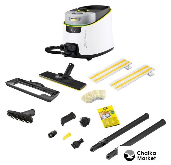 Дополнительные насадки и приспособления | - Универсальная салфетка для пола EasyFix: 2 шт.- Обтяжка из микроволокна для ручной насадки: 1 шт.- Порошок антинакипина: 3 шт.- Точечное сопло- Ручная насадка- Мощное сопло- Круглая щетка, черная: 1 шт.- Круглая щетка, большая- Щетка для очистки швов- Насадка для пола: EasyFix- Удлинительные трубки (2 х 0,5 м)- Насадка для очистки ковров |