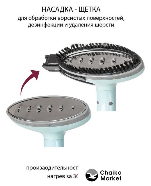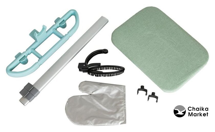 Дополнительные насадки и приспособления | отпариватель, доска для глажения, гибкий шланг в защитной оболочке, насадка для отпаривания, плечики для одежды с прищепками для брюк и юбок, перчатка, гарантийный талон, инструкция на русском языке. |
