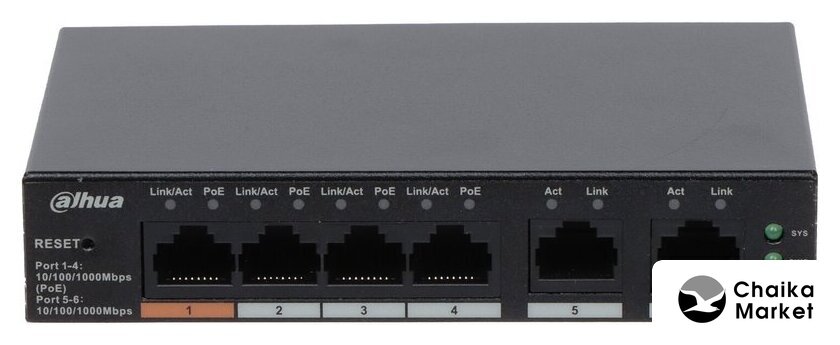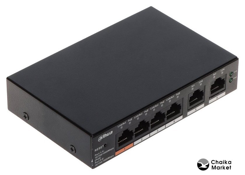 неуправляемый, настольный/настенный, матрица 1.2 Гбит/с, 6x100Mbit, PoE, бюджет 60 Вт