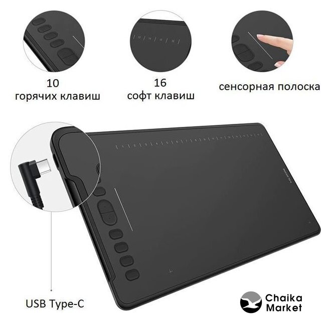 Комплект поставки | - Графический планшет- Стилус PW100- 8 сменных наконечников- Подставка для пера- Кабель USB - USB Type-C- OTG адаптер USB Type-C- OTG адаптер Micro USB- Краткое руководство пользователя |