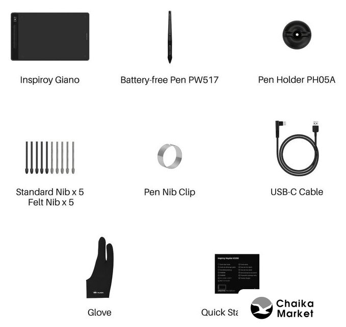| Комплект поставки | - Графический планшет- Перо PW517- Подставка для пера- Стандартные наконечники (5 шт.)- Войлочные наконечники (5 шт.)- Кабель для подключения (USB - USB TypeC)- Перчатка- Краткое руководство пользователя- Гарантийный талон |