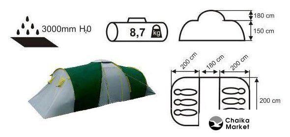 кемпинговая, весна/лето/осень, 3-местная, 2 входа, 1 комната, противомоскитная сетка, тамбур, штормовые оттяжки, ДхШхВ: 325x220x130 см