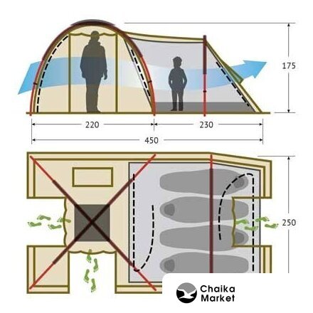 кемпинговая, лето, 12-местная, 2 входа, 1 комната, противомоскитная сетка, штормовые оттяжки, ДхШхВ: 460x460x210 см