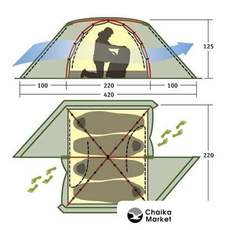 треккинговая, весна/лето/осень, 3-местная, 2 входа, 1 комната, противомоскитная сетка, тамбур, штормовые оттяжки, ДхШхВ: 390x215x115 см