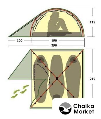 треккинговая, весна/лето/осень, 3-местная, 3 входа, 1 комната, противомоскитная сетка, тамбур, штормовые оттяжки, ДхШхВ: 455x190x115 см