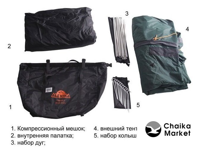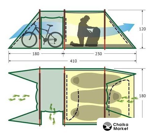 треккинговая, весна/лето/осень, 3-местная, 2 входа, 1 комната, противомоскитная сетка, тамбур, штормовые оттяжки, ДхШхВ: 340x180x110 см