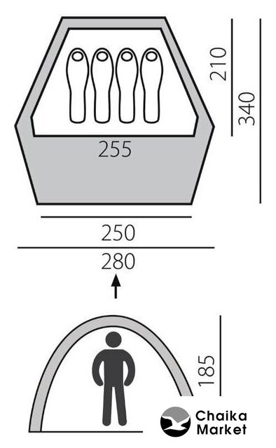 треккинговая, весна/лето/осень, 3-местная, 2 входа, 1 комната, противомоскитная сетка, тамбур, штормовые оттяжки, ДхШхВ: 400x180x120 см