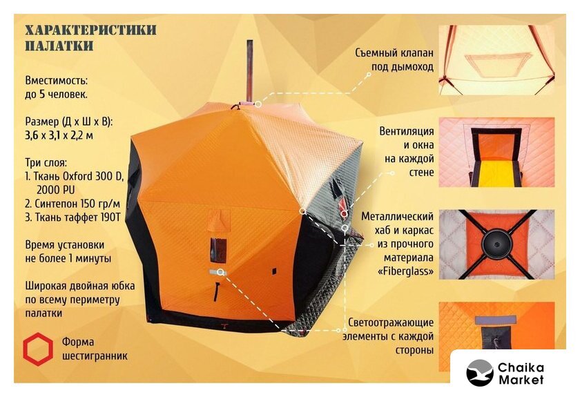 для зимней рыбалки, зима, 3-местная, 1 вход, 1 комната, штормовые оттяжки, ДхШхВ: 270x180x210 см