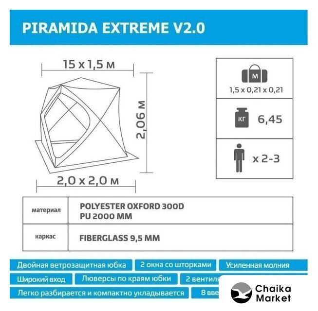 для зимней рыбалки, зима, 4-местная, 2 входа, 1 комната, ДхШхВ: 215x215x200 см