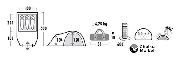треккинговая, весна/лето/осень, 3-местная, 2 входа, 1 комната, противомоскитная сетка, тамбур, штормовые оттяжки, ДхШхВ: 340x190x110 см