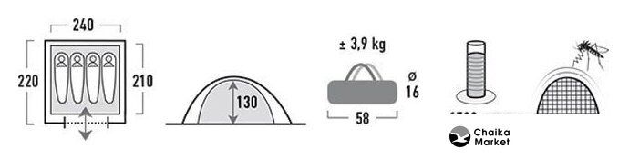 треккинговая, весна/лето/осень, 4-местная, 2 входа, 1 комната, противомоскитная сетка, тамбур, штормовые оттяжки, ДхШхВ: 375x255x140 см
