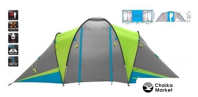 кемпинговая, весна/лето/осень, 4-местная, 2 входа, 2 комнаты, противомоскитная сетка, тамбур, штормовые оттяжки, ДхШхВ: 505x220x200 см