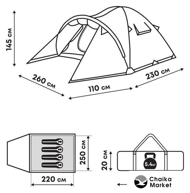 треккинговая, весна/лето/осень, 3-местная, 2 входа, 1 комната, штормовые оттяжки, ДхШхВ: 340x210x150 см
