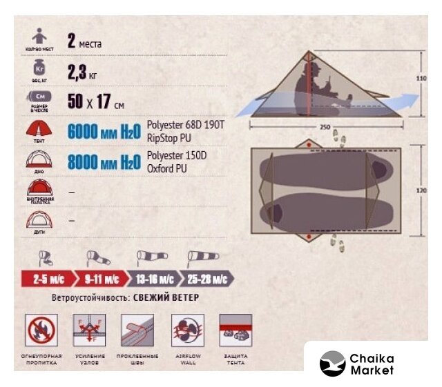 треккинговая, весна/лето/осень, 1-местная, 2 входа, 1 комната, противомоскитная сетка, тамбур, штормовые оттяжки, ДхШхВ: 210x190x100 см